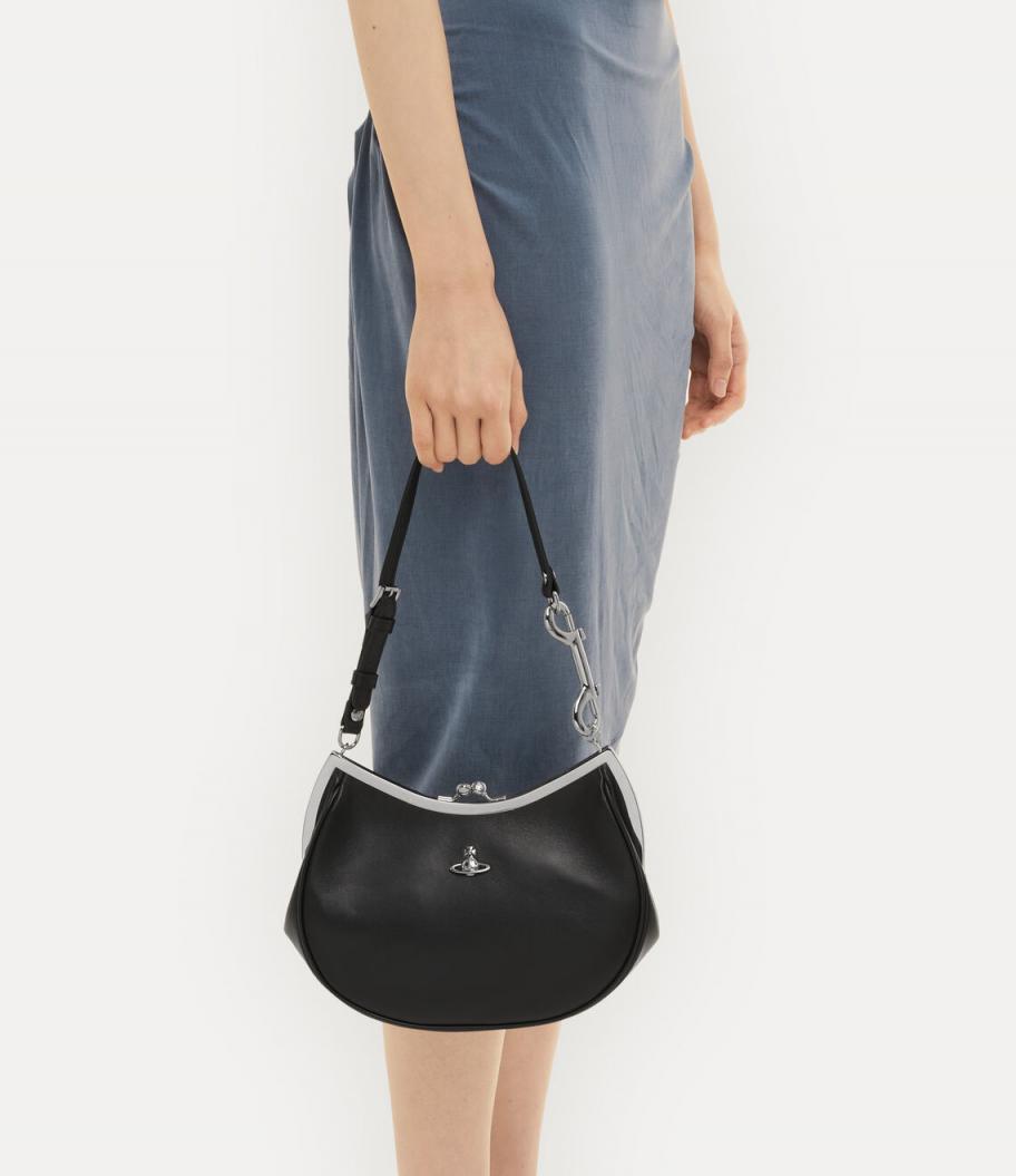 The Charm Frame purse offers a fresh interpretation of the classic Granny Frame purse in soft leather. Its design showcases a newly developed curved metal frame and a custom-made crescent silhouette. The bag is further elevated by a DIY-inspired dog clip strap and metal orb silhouette on the front panel, which symbolises tradition, encircled by the celestial rings of Saturn, symbolising the future.